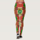 Aqui está um impressão de tecido de patchwork para as suas pernas. Tem cores dinâmicas laranja, verde, vermelha e dourada. A cintura tem um tom vermelho coordenado.