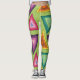 Estas leggings têm um design dos anos 70 em triângulos concêntricos em tons de lacre, laranja, amarelo, roxo e rosa em um campo de verde.