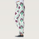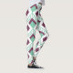 Estas leggings têm um design de arte de diamantes verdes assados com linhas diagonais e diamantes de beringela em um campo de branco.