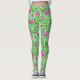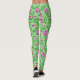 Leggings em um William Morris, Art Nouveau, impressão têxtil de irises e folhas, melhoradas digitalmente e coloridas, em cor-de-rosa magenta roxo e orquídea, com folhas de esmeralda e verde limão, sobre um fundo verde pastoso
