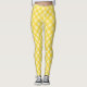 Leggings amarelas com um padrão xadrez branco são mostradas vistas da frente e de trás. Elas são combinadas com tênis preto e branco em um fundo simples.