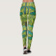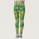 Leggings with a vibrant dragonfly pattern in blue and green over a leafy yellow background. The wearer pairs them with black and white sneakers.