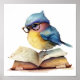 Pequeno pássaro azul e amarelo bonito vestindo óculos e lendo um livro. Excelente por encorajar o seu filho a ler. Também seria um bom presente para um professor para a sala de aula. Decor de viveiro quadrado de 12" x 12". Imagem assistida por IA adquirida com licença comercial. Trabalho de arte: MokoDE