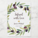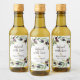 Esta etiqueta de garrafa para lembranças de casamento de azeite de oliva tem uma moldura de ramos de oliveira em aquarela com folhas verdes e azeitonas pretas. A mensagem "Infundido com Amor" e os nomes são escritos em uma fonte manuscrita; o restante é escrito em letras maiúsculas. Acima dos nomes há um pequeno coração dourado. O fundo é branco.