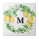 "Watercolor Lemon Floral Wreath w Family Monogramas cerâmico azulejo" apresenta o monograma da sua família em uma camada aquosa de limões, flores de citros e folha verde, todos pintados manualmente pela artista e designer internacionalmente licenciada Audrey Jeanne Roberts, copyright.