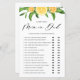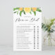 Adivinha quem disse. Era a mãe ou o pai? | Adicione este chá de fraldas divertido e divertido Que Ele Disse Que Ela Disse Cartão de Jogo ao seu evento. Esta mãe ou cartão de jogo de pai personalizável apresenta ilustrações de cor d'água de limão e laranjas com acentos verdes. Personalize adicionando suas perguntas. Este cartão de chá de fraldas cítrico é perfeito para chás de fraldas de primavera e verão.