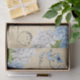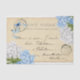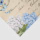 Os hydrangeas azuis e brancos bonitos do vintage e as borboletas azuis são ajustados em um cartão francês do vintage no creme do sepia com escrita e carimbos postais para fazer um lenço de papel temático francês floral bonito para artesanatos do papel de embrulho ou do decoupage.