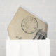 Uma grande imagem do vintage da catedral histórica de Notre Dame em Paris é ajustada em um cartão francês do vintage no creme do sepia com escrita e carimbos postais para fazer um lenço de papel temático francês bonito para artesanatos do papel de embrulho ou do decoupage.