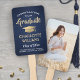 Add a cool personalized touch to a college or high school graduation party with these custom photo navy blue, gold and white hand fans. Design features a blue faux brushed stainless steel background, one picture of the graduate, stylish modern typography, handwritten style script calligraphy, and a customizable message reading "Congratulations to our Graduate". Text at the bottom includes class year, school name, and an optional line for degree, honors, or favorite inspirational quote, thanks mom and dad, or other info. All text is simple to personalize. Please note that gold is printed color, not metallic foil. Makes an elegant customized idea for graduation party favors and decorations. Perfect for displaying a favorite photo, such as a senior picture or image from the commencement ceremony. Congratulations to the graduate!