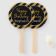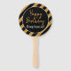 Padrão listrado preto e dourado com ventilador branco de festa de aniversário. A design apresenta um padrão de listras preto e branco, um círculo preto com uma borda branca e o texto "Parabéns!" Fácil de personalizar com o seu nome.