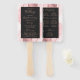 This elegant, modern wedding program fan features a blush pink agate background trimmed with rose gold faux glitter. The text appears in elegant rose pink handwriting and copperplate fonts on an off-black rectangle.
