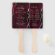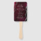 This elegant, modern wedding program fan features a burgundy red agate background trimmed with silver faux glitter. The text appears in silver gray handwriting and copperplate fonts.