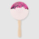 Cabeçalho floral vermelho magenta legante no ventilador de mão branca. A imagem pode ser personalizada e trocada com a sua imagem favorita. O verso tem duas silhuetas cor-de-rosa sobre fundo de rosa de ouro claro. Bougainvilleas são acolhedoras e bonitas!