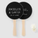 Ventiladores modernos de mão de casamento com design preto minimalista com seus nomes em uma fonte grande junto com sua data de casamento. A parte de trás tem seu obrigado personalizado que você envia. Esta design é simples o suficiente para um casamento formal, mas faz uma declaração ousada.