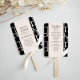 Mantenha os convidados confortáveis e informados com este leque de programa de casamento moderno. Com tipografia editorial refinada e uma moldura abstrata preta e branca ousada, este design serve como um programa de cerimônia elegante e um leque prático para celebrações em clima quente.