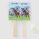 Este ventilador de mão tem dois cavalos em pé na grama verde ao lado de uma cerca de madeira sob um céu azul. Um é uma égua cinza e o outro é seu potro marrom. Personalize seu texto na frente e no verso com os modelos.