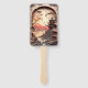 Um belo conjunto marrom de fãs de mão com uma cena de recorte de papel que mostra o antigo edifício chinês, árvores, montanhas e lago.