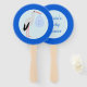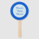Este fã de mão incrível apresenta uma imagem gráfica de uma bela Stork branca com penas pretas de cauda segurando-as num pacote azul pálido de cobertores. Há um texto azul no pacote que diz "Menino". Esta design é perfeita para celebrar um chá de fraldas.