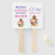 Um fã de mão para um evento social sorvete como um chá de fraldas ou uma festa de aniversário. A parte de trás diz: a vida é curta e come mais sorvete. ilustrado com o desenho de um sundae de sorvete de 3 furos com aspersão colorida. Um cone de sorvete com colheres de chocolate, morango e baunilha. Uma tigela de sorvete neopolita com uma cereja em cima. Morangos e uma fruta de abacaxi sentam ao lado das tigelas. Sumério e doce.