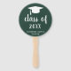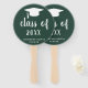 Ventiladores de mão de graduação minimalista apresentando um design simples e clássico com um boné de formando e uma "classe de ano" em uma escrita grossa juntamente com o nome do formando em branco sobre um fundo verde da floresta. A cor de fundo pode ser alterada para qualquer cor que você desejar. Um estilo tradicional com um talento moderno para um formando feminino.