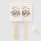 Ventilador de mão com uma cor de pêssego e um padrão listrado branco. Uma ilustração digital feita com aquarelas. Um coelho encantador vestindo um vestido azul sentado em uma cesta cercada por seus ovos. Borboletas à volta da cesta que é decorada com um buquê de flores de rico.