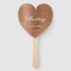 Um simples mas elegante leque de programa de casamento em forma de coração para um tema de casamento de cobre. Os títulos e os nomes (e as iniciais) da noiva e do noivo são escritos em uma elegante caligrafia, o resto em maiúsculas. O fundo é de metal falso cobre, o texto é branco. No verso, tem no lado esquerdo o programa da cerimônia de casamento e, no lado direito, os membros da festa de casamento (com 2 colunas diferentes para a equipe da noiva e a equipe do noivo) e abaixo deles uma curta mensagem de agradecimento.
