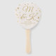 Um delicado leque de mão de remo de casamento cor-de-rosa com respingos de confete dourado e espaço para suas iniciais e talvez sua ordem de serviço no verso.