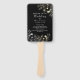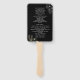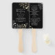 Elegantes leques de mão para programa de casamento preto boho chic vintage com renda floral prateada e dourada e caligrafia moderna simples.