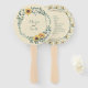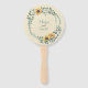 Este lindo leque manual apresenta uma borda externa com girassóis e uma coroa de eucalipto. Personalize com os nomes da Noiva e do Noivo. No verso há um padrão floral de girassol em torno da borda. Você personaliza a parte de trás com o programa do seu casamento, bem como a data.