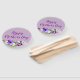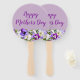 Em ventoinhas roxas, as palavras "dia de as mães feliz" aparecem em roxo por cima de um grupo de flores roxas.