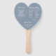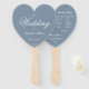 Um fã do programa de casamento em forma de coração simples mas elegante para um tema de casamento azul empoeirado. O fundo é azul empoeirado, o texto é branco. Os títulos e os nomes (e as iniciais) da noiva e do noivo são escritos em uma escrita elegante, o restante em bonés. No verso, tem no lado esquerdo o programa da cerimônia de casamento e, no lado direito, a festa de casamento (com 2 colunas diferentes para a equipe da noiva e do noivo). e sob eles uma pequena mensagem de agradecimento.