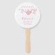 É um ventilador de mão rosa com ilustração de uma garota bonita