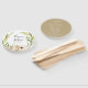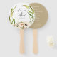 Linda coloração aquática, folhagem botânica e coroa floral de jardim, fãs de mão do programa de casamento. A parte traseira apresenta fundo de cores esticadas sólidas e linhas de texto para uma lista detalhada da festa de casamento.