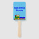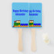 Um trem está descendo os trilhos acima de sua mensagem personalizada (mostrada: Feliz Aniversário Alexandre). Alterar o número do comboio para a idade da criança (ver: 1). A mão faniza o céu azul.