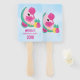 Um fã de mão personalizado com uma bela ilustração de um flamingo rosa com algumas melancias e abacaxis. Esquema de cor rosa e verde. Sumério e tropical. O fundo é uma imagem de aquarela azul-clara. Perfeito para uma festa de aniversário ao ar livre no verão quente.