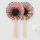 Esta maravilhosa fã de mão mostra uma bela fotografia de um girassol rosa pálido. O girassol é naturalmente cor-de-rosa e as pétalas têm um anel exterior cor-de-rosa claro e um anel interior rosa escuro. O meio onde estão as sementes é preto. Esta fotografia foi tirada num jardim.