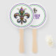 This paddle fan is shown in a festive Mardi Gras Fleur de Lis print.