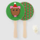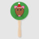 Este fã de mão espetacular mostra uma caricatura engraçada de um rato de Natal com grandes olhos redondos, orelhas cor-de-rosa, um nariz rosa pequeno e sussurros giros e fofinhos. O rato está vestindo um chapéu de Papai Noel vermelho e branco pronto para o Natal.