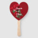 Ventiladores de casamento em forma de coração em vermelho com rosa. Adicione nomes da noiva e noiva a um lado, e um verso do casamento ou dizendo ao outro. O roteiro branco é usado e o texto de exemplo é, "Para ter e manter a partir deste dia em frente." Este bonito ventilador faz a adição perfeita a qualquer cerimônia ao ar livre e pode ser usado por hóspedes para manter legal e/ou manter os insetos afastados.