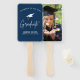 Ventilador de mão de fotografia de graduação moderna com letras brancas em negrito com fundo de Marinho. O design apresenta um boné de formatura branco com a frase "Parabéns ao nosso Formando". Personalize o sinal de graduação laranja adicionando o nome do formando, o nome da escola e o ano de graduação. Para uma aparência mais personalizada, mude o fundo para as cores da sua escola. O poster de graduação é perfeito para usar para a sua festa de segundo grau ou formandos!