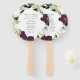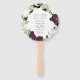 Fã de mão do programa de casamento floral elegante com seus nomes cercados por coroa de flores roxas de ameixa escura e aquarelas brancas com folha de ouro rosa falso e folhas verdes. Personalize os fãs do programa de casamento floral adicionando sua data e local do casamento, ordem dos eventos e festa de casamento no verso. Projetado para coordenar com a nossa coleção de casamento Dark Plum Floral.