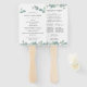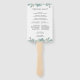 Com elegância inspirada na natureza, este fã de casamento usa lindos filhotes de cor d'água com uma amostra de modelo do programa de casamento que você pode personalizar com seu texto do programa de casamento. A parte traseira do ventilador do programa é configurada com um exemplo de texto para os nomes dos participantes da festa de casamento. Você pode adicionar ou excluir linhas de texto, redimensionar ou alterar o estilo da fonte, bem como mover o texto para atender às suas necessidades. Um pacote de artigos de casamento e produtos está disponível neste design de eucalipto para uma visão coordenada no seu dia especial. O esquema de cores verde/azul-esverdeado funciona bem em casamentos durante qualquer estação do ano.