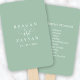Mantenha seus convidados legal e informados com este elegante fã de mão do programa de casamento verde de menta. Apresentando uma design minimalista com tipografia moderna, este ventilador de mão fornece um toque sofisticado e prático para sua cerimônia de casamento. A cor suave e o layout limpo mostram os detalhes do programa de casamento em um formato na moda e fácil de ler. Perfeito para qualquer tema de casamento, esses fãs de mão garantem que seus convidados fiquem confortáveis enquanto seguem seus eventos especiais.
