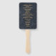 Programa da cerimônia de casamento/ordem de serviço em leques manuais bonitos e elegantes em azul marinho com texto dourado. Eles incluem o programa da cerimônia juntamente com os nomes dos pais da noiva e do noivo, o celebrante, a corte de honra e outros participantes. Entre em contato conosco para obter ajuda com personalização ou produtos correspondentes.