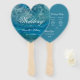 Um leque de programa de casamento em forma de coração. Na frente, o fundo é uma geoda azul com muitas nuances de azul, o verso é apenas azul. Os títulos e os nomes (e as iniciais) da noiva e do noivo são escritos em uma fonte caligráfica elegante, o restante em letras maiúsculas. O texto é branco. No verso, está à esquerda o programa da cerimônia de casamento e, à direita, os membros da festa (com 2 colunas diferentes para a equipe da noiva e a equipe do noivo). e abaixo deles uma curta mensagem de agradecimento.