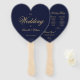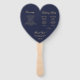 Um fã do programa de casamento em forma de coração simples mas elegante para um tema de marinho e casamento de ouro. Os títulos e os nomes (e as iniciais) da noiva e do noivo são escritos em uma escrita elegante, o restante em bonés. O fundo é marinho azul, o texto é ouro amarelo. No verso, tem no lado esquerdo o programa da cerimônia de casamento e, no lado direito, a festa de casamento (com 2 colunas diferentes para a equipe da noiva e do noivo). e sob eles uma pequena mensagem de agradecimento.