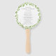 Leque de mão de programa de casamento rústico com seus detalhes dentro de uma coroa composta por folhas de oliveira verde. Seus detalhes estão em uma fonte cinza média. A frente tem os eventos da sua cerimônia e o verso tem os membros da sua festa de casamento. Os leques de mão são perfeitos para um casamento ao ar livre no verão.