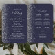 Este elegante e moderno fã do programa de casamento mostra um fundo azul escuro coberto de cintilação de prata. O texto aparece em letras elegantes de cinza prateada e fontes em placas.