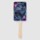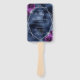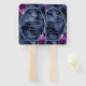 Este elegante fã do programa de casamento apresenta uma estrutura geométrica prateada decorada com buquês florais roxos e prateados. O texto aparece em letras elegantes de cinza prateada e fontes de impressão em um fundo azul marinho de folha de rosto.