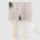 Este fã do programa de casamento apresenta belas penas azuis, bronzeadas e pavões verdes nos cantos superior esquerdo e inferior direito deste fã do programa de casamento. Seu texto personalizado está em azul escuro e marrom. As imagens e o texto são colocados sobre uma cinza de luz angustiada e sobre um fundo que complementa as cores das penas. A parte traseira do ventilador tem um fundo correspondente com bastante espaço para suas informações. Certifique-se de ver os produtos de casamento correspondentes, incluindo convites, em nossa loja.
